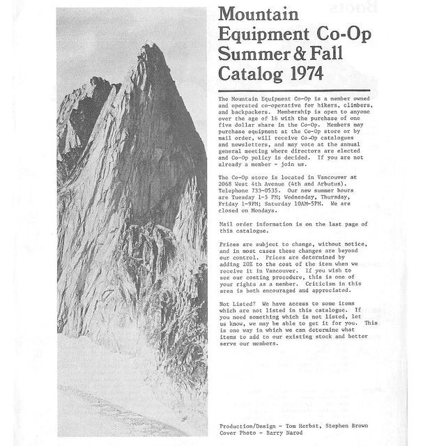 Mountain Equipment Coop was started back in 1971 by a bunch of local guys here in Vancouver who had a hard time finding the gear they wanted. Similar to how Patagonia got its start at around the same time.